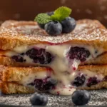 A decadent and creamy breakfast featuring thick brioche bread stuffed with a rich blueberry cheesecake filling, fried until golden brown.