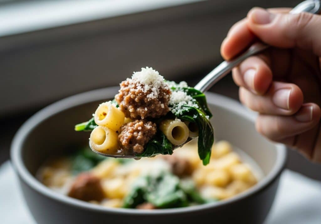Sauté aromatics just past translucent to build sweetness before simmering; this balances the savory sausage without extra sugar. Keep the pot below a full boil when adding cream and Parmesan so proteins stay integrated and the soup remains glossy.