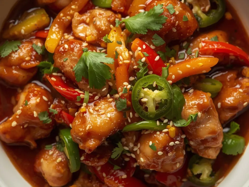 A bold and flavorful chicken stir-fry with fresh jalapeños, garlic, and peppers coated in a glossy savory sauce.