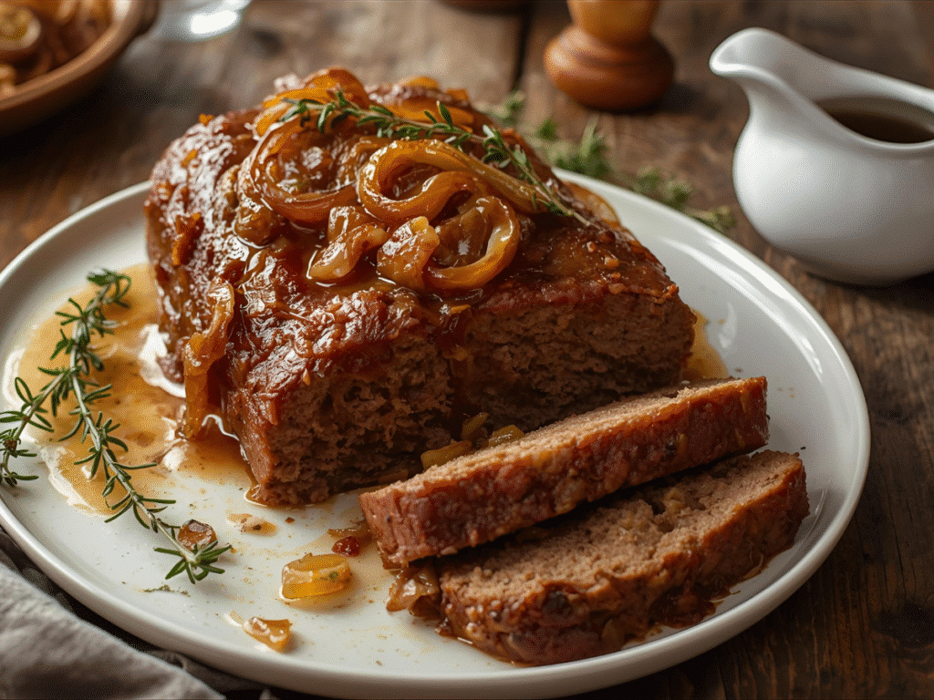 A cozy French Onion Meatloaf layered with caramelized onions, seasoned ground beef, and melty Swiss or Gruyere, finished with a light jus for glossy slices.