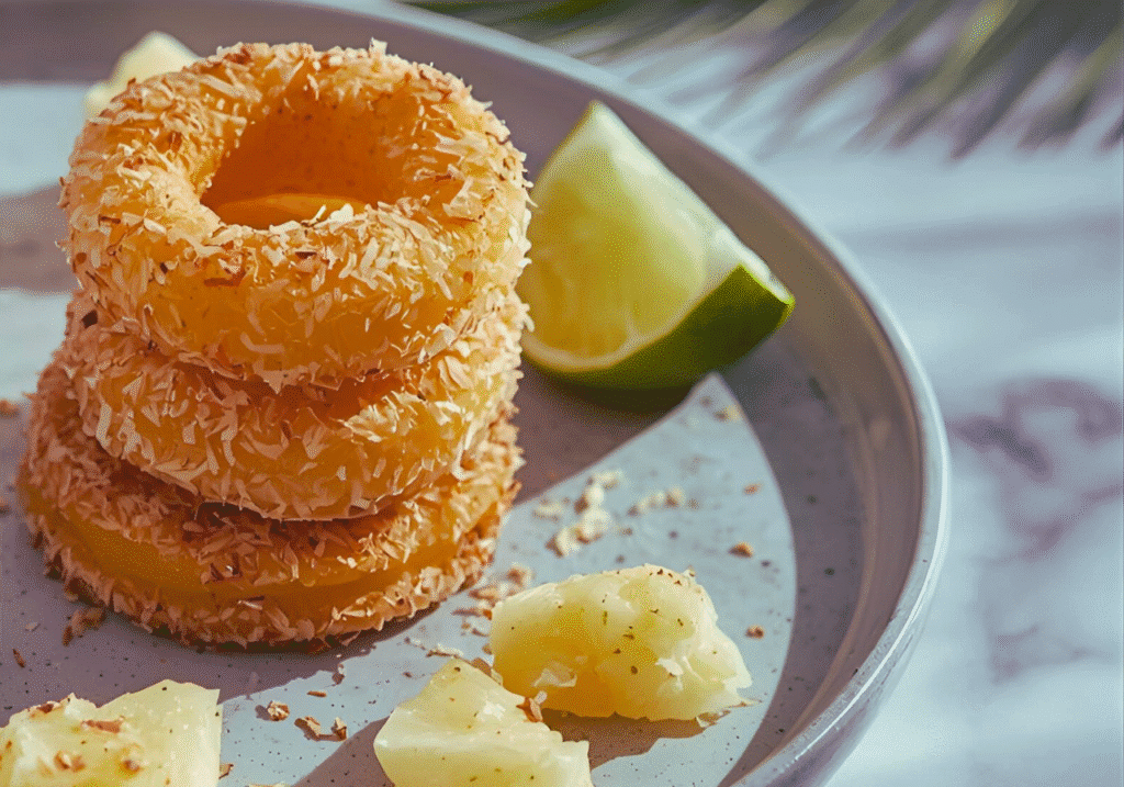 Try this easy Fried Pina Colada Rings recipe featuring crispy pineapple rings soaked in rum and coated with coconut. Perfect for summer parties or tropical dessert lovers, these golden rings topped with melting white chocolate bring an exotic, indulgent flavor to your snack table.