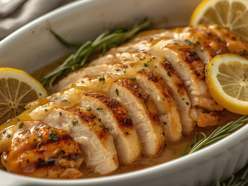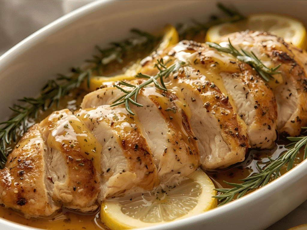 Juicy oven‑baked chicken breasts simmered in a bright lemon, garlic, and fresh rosemary pan sauce for an easy weeknight dinner.