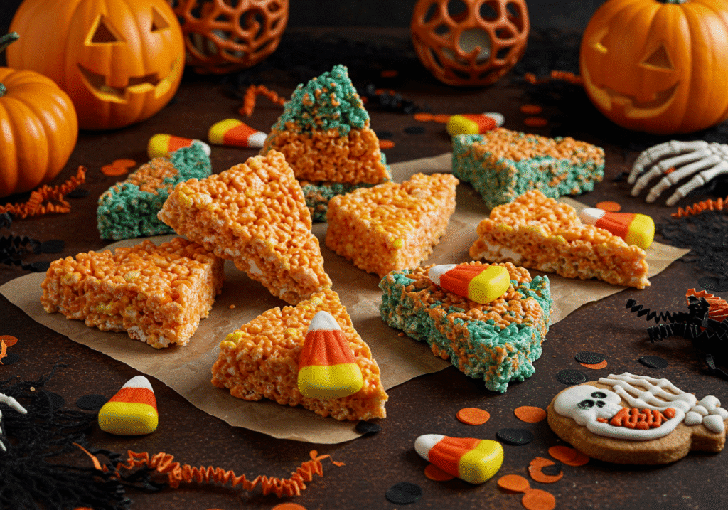 Layer yellow, orange, and white Rice Krispies to look like candy corn triangles.