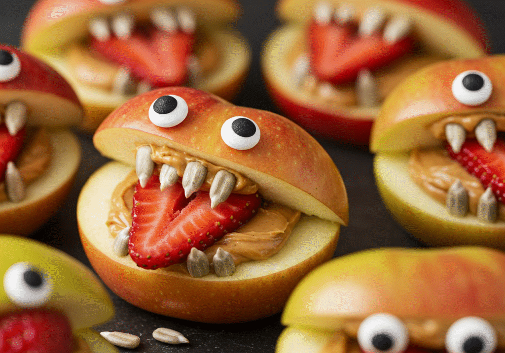 Slice apples, spread with peanut butter, add strawberry tongues and candy eyes for a creepy monster mouth.