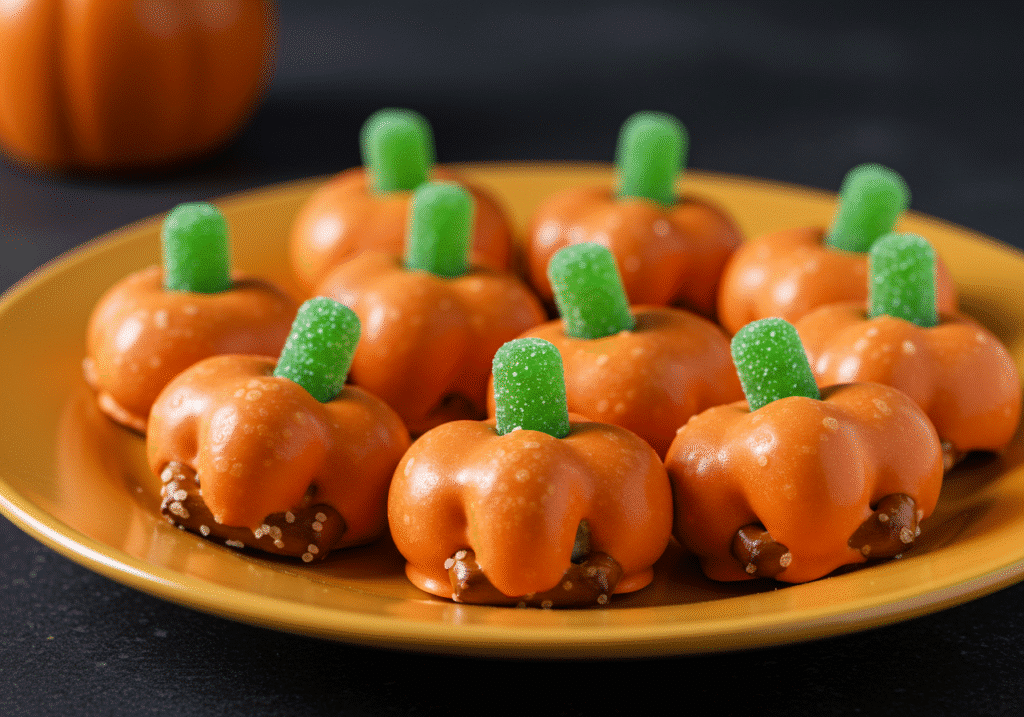 Dip pretzels in orange candy melts and top with a green M&M for a pumpkin stem.