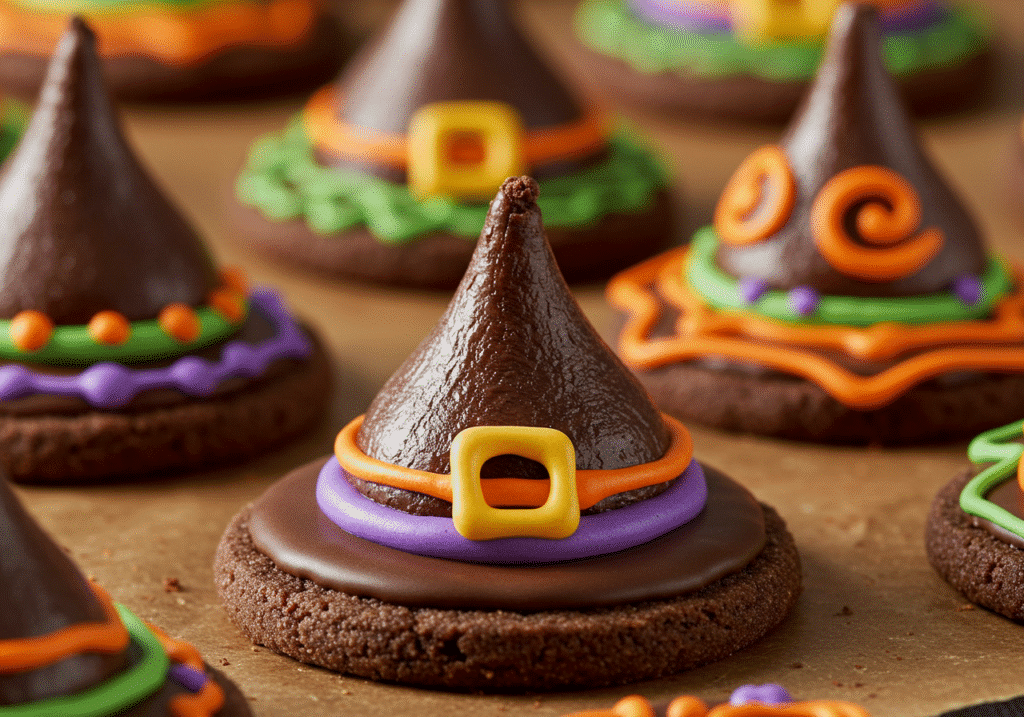 Place a Hershey’s Kiss on a chocolate cookie, add a band of icing to make a witch hat.