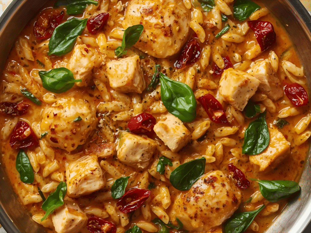 A one-pot creamy chicken dinner featuring tender orzo, sun-dried tomatoes, and spinach in a rich parmesan sauce. Ready in 30 minutes.